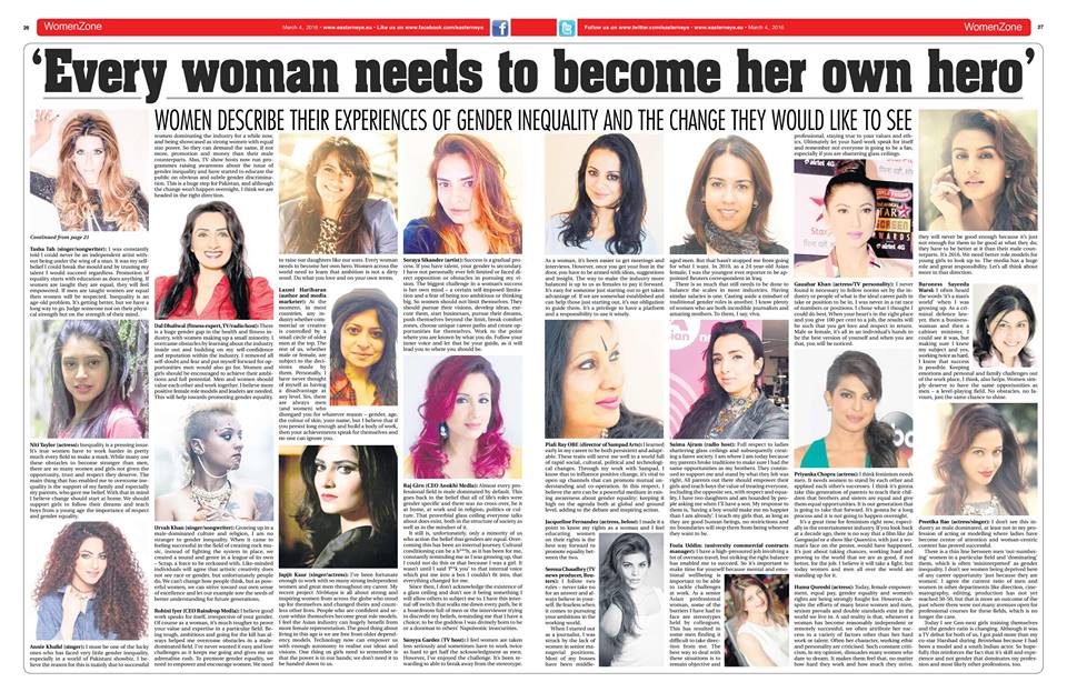 SORAYA SIKANDER (Artist) “Success is a gradual process. If you have talent, your gender is secondary. I have not personally felt limited or faced direct opposition or obstacles in pursuing my vision. The biggest challenge in a woman’s success is her own mind – a certain self-imposed limitation and a fear of being too ambitious or thinking big. So women should not limit themselves. They should pursue their visions, develop ideas, execute them, start businesses, pursue their dreams, push themselves beyond the limit, break comfort zones, choose unique career paths and create opportunities for themselves. Work to the point where you are known by what you do. Follow your inner voice and let that be your guide, as it will lead you to where you should be.”